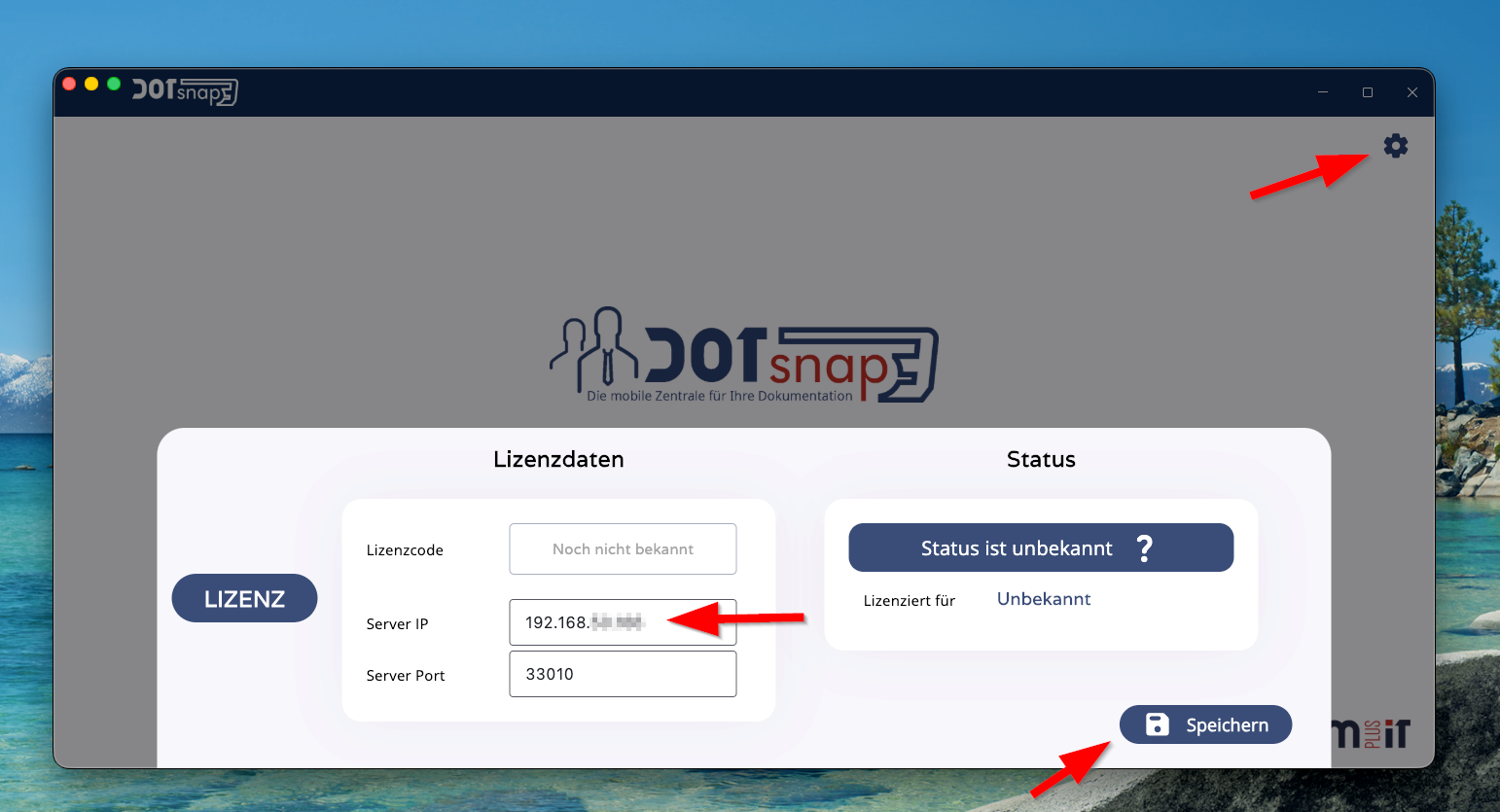 Öffnen Sie über das Zahnrad oben rechts die Einstellungen und tragen Sie die korrekte Server-IP ein.