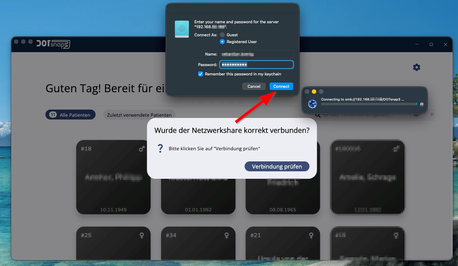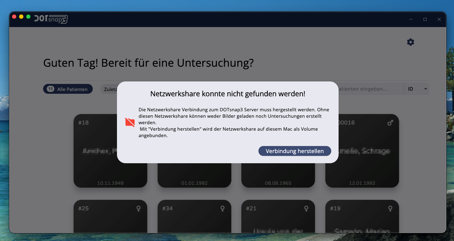 Der Netzwerk-Share wird beim Start des Programms geprüft. Unter Umständen trennt macOS diese Verbindung nach einem Neustart.